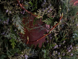 「深閑の森 聖夜のリース」は様々な針葉樹の織りなす薫りや美しい造形、深い緑色の色彩を基調とし、静かで厳かな森の美しい風景をイメージして一つ一つ大切にお作りしています。