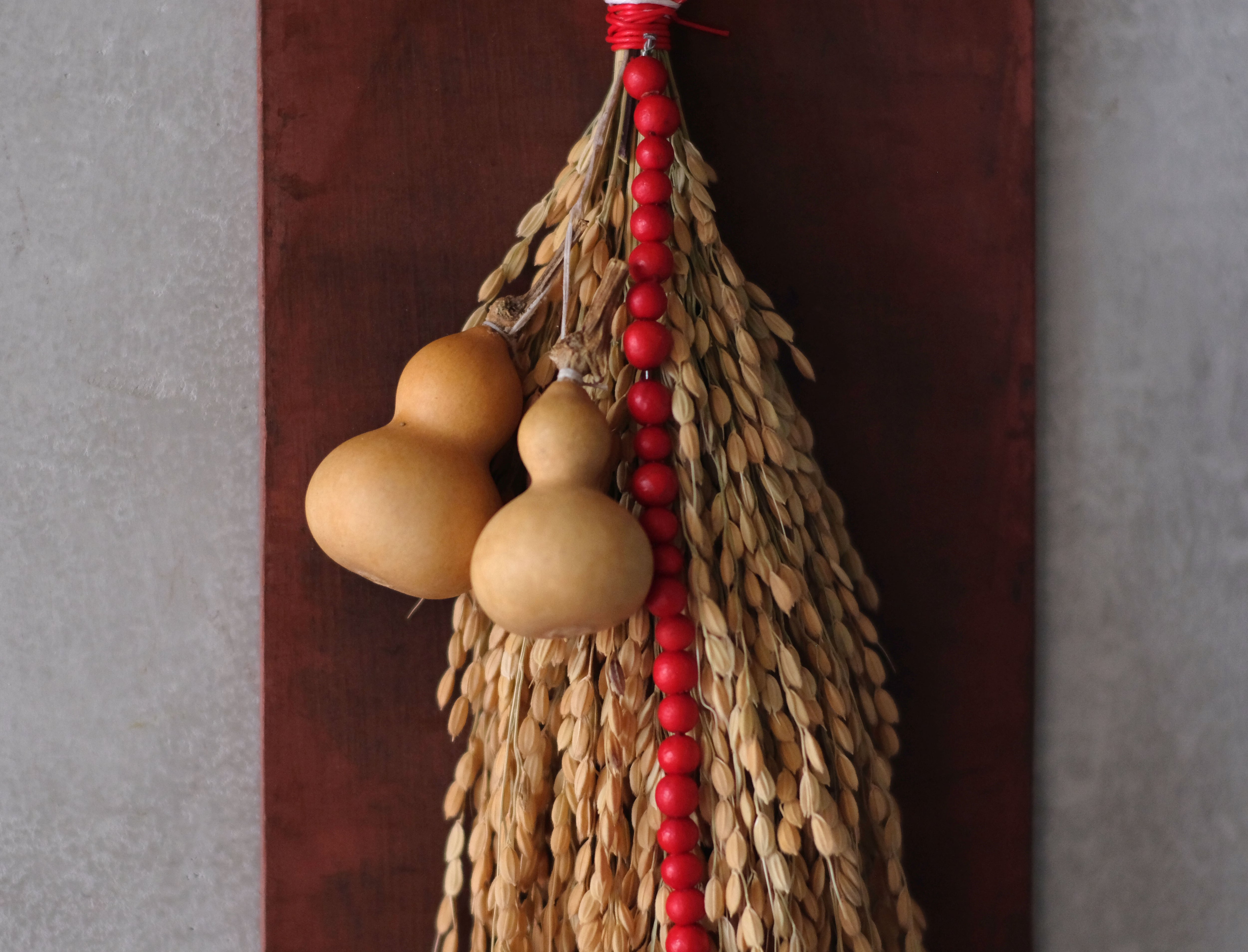 漆喰を施した板に稲を中心に簡潔に仕上げたお飾りです。