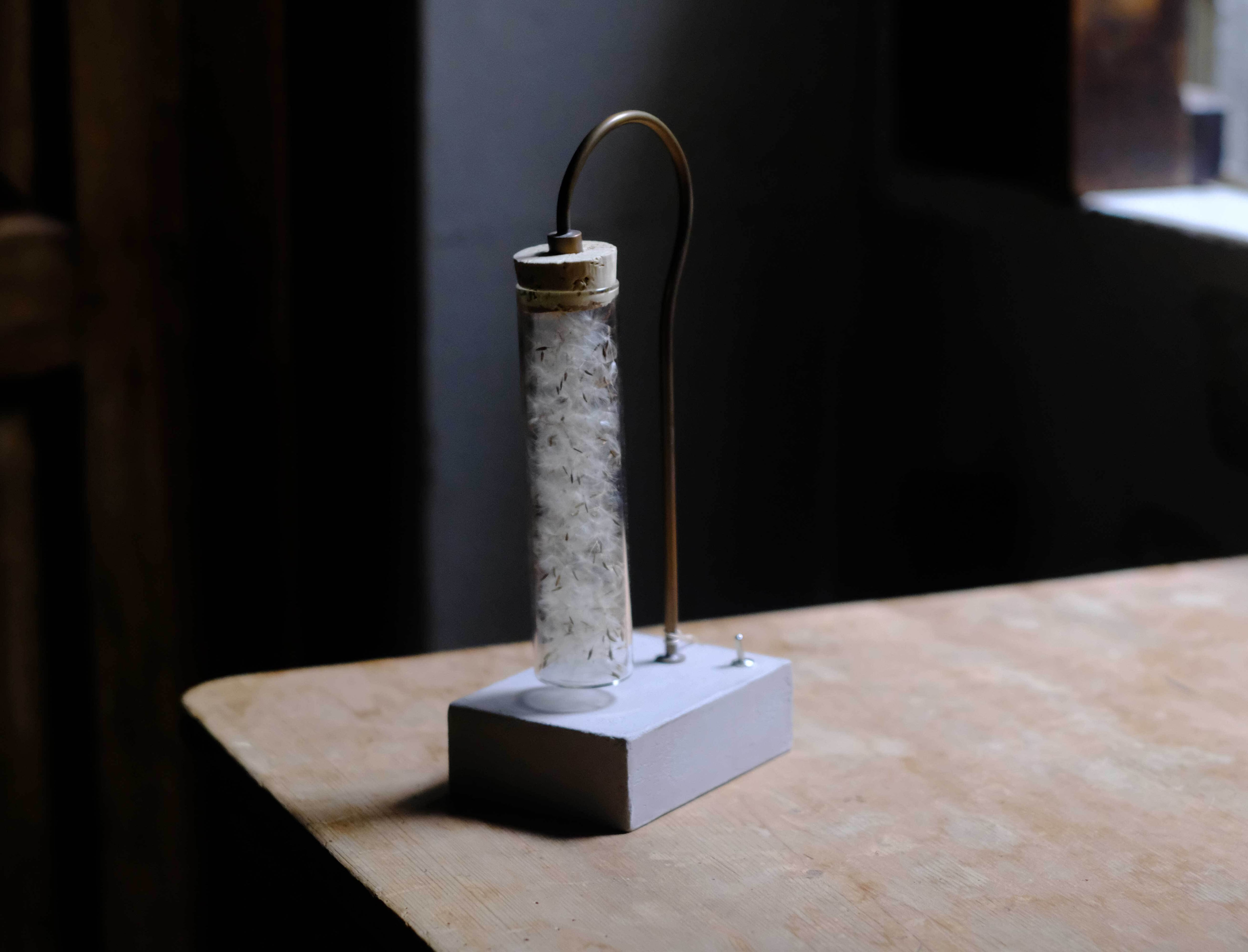*本作品は単4電池2つで灯る、コードや電源の必要のない灯りの作品です。