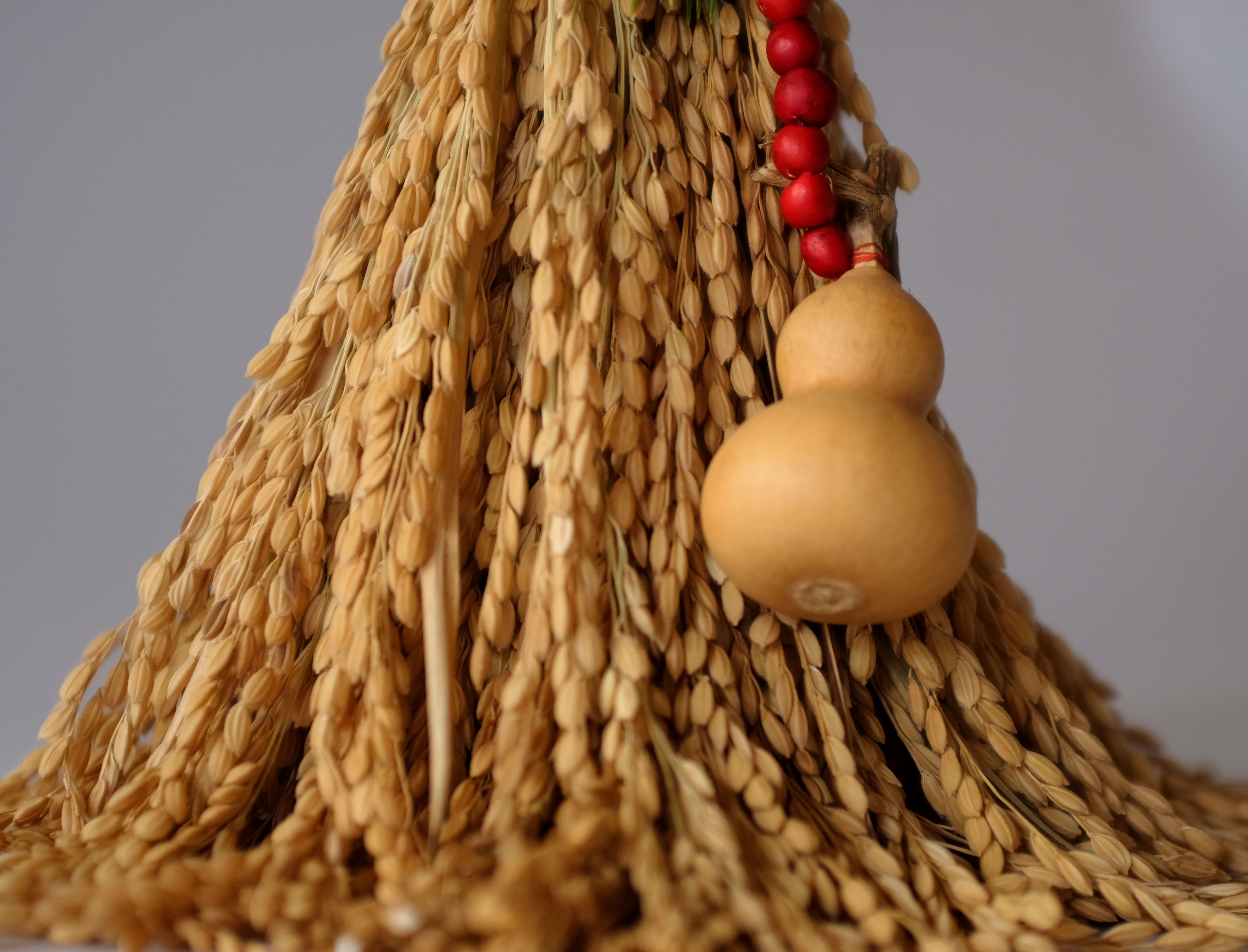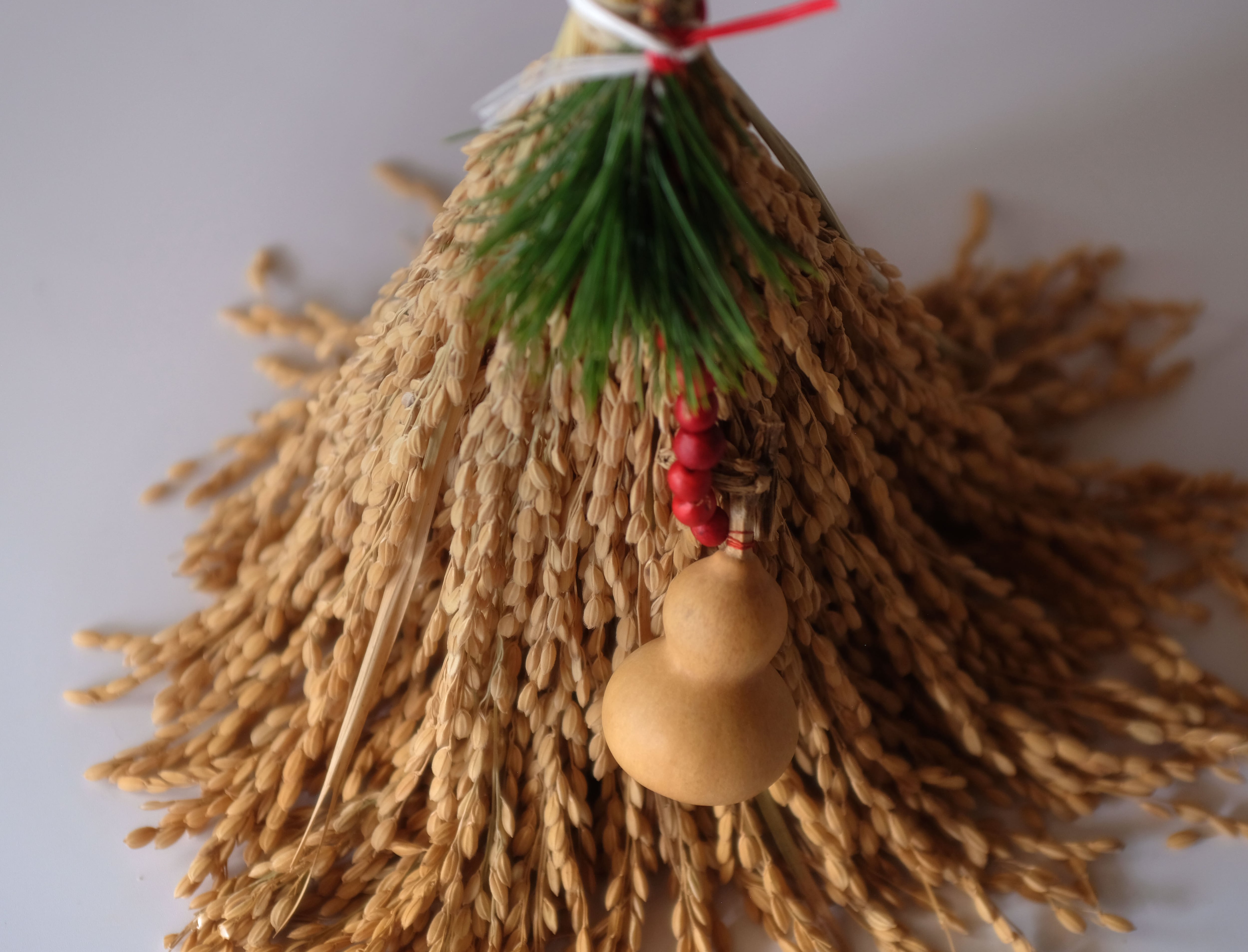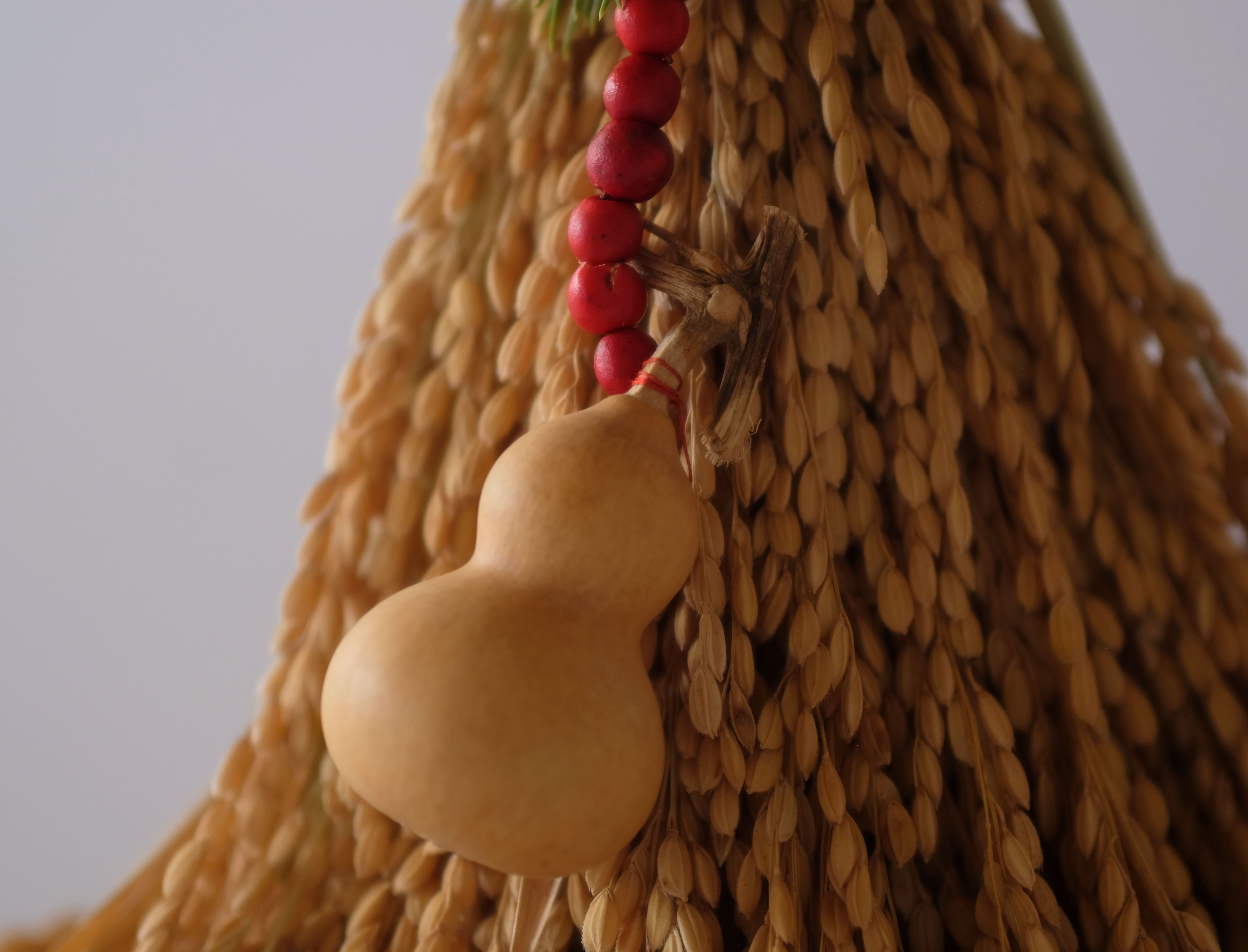 稲を中心に簡素に仕上げたお飾りです。南天や瓢箪をポイントにあしらいました。