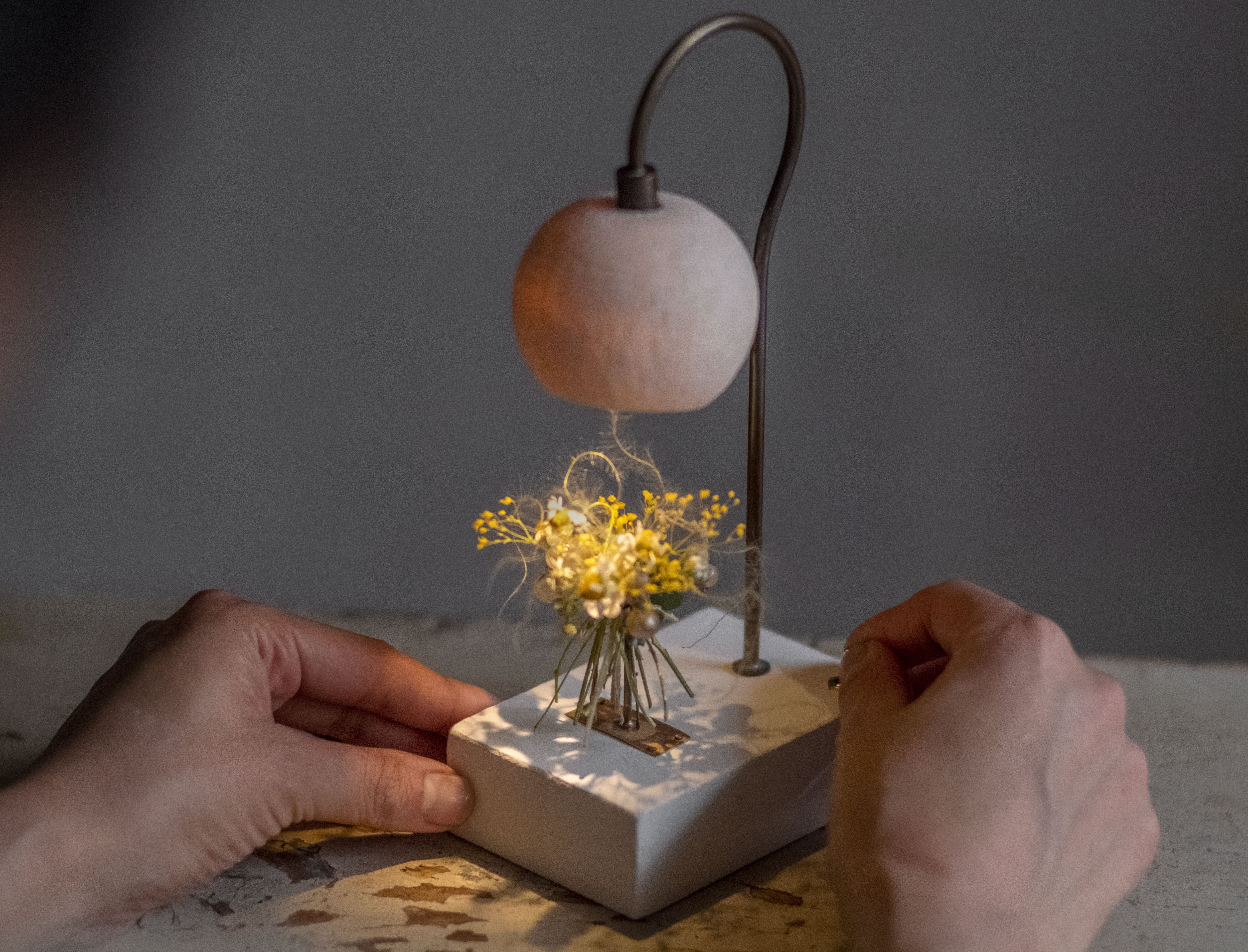 *本作品は単4電池2つで灯る、コードや電源の必要のない灯りの作品です。